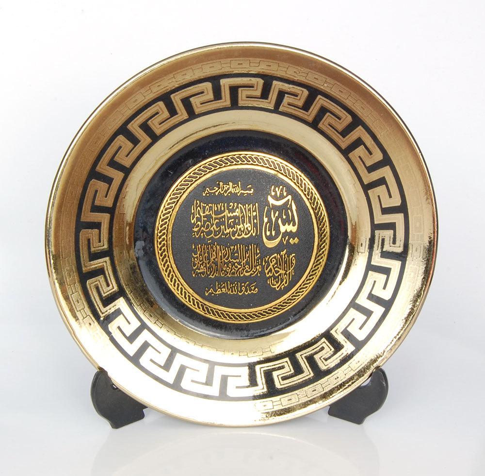 Assiette décorative Noir en porcelaine avec la calligraphie " yasin " décorée de jolis motifs dorés... Livrée avec son support.