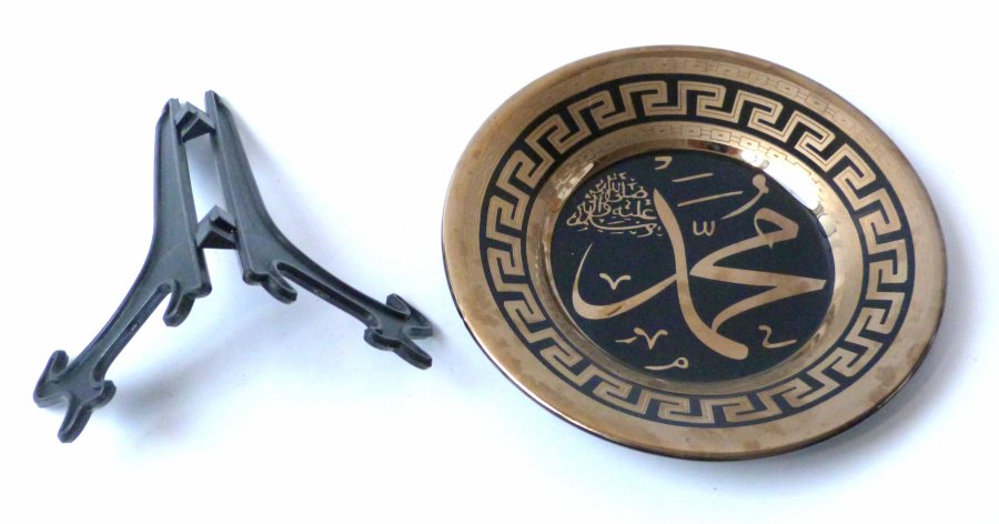 Assiette decorative noire avec la calligraphie "Mohammed (SAW)" avec jolis motifs dores