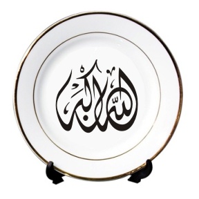 Assiette en porcelaine avec calligraphie artistique de l'invocation "Allah Akbar" (Allâhu Akbar) réalisée par un calligraphe professionnel. Cette assiette se mariera bien avec tous types de mobilier.
