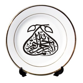 Assiette en porcelaine avec calligraphie artistique de l'invocation et verset coranique "Bismillâhi Rahmâni Rahîmi" (Au Nom d'Allah Le Clément, Le Miséricordieux) réalisée par un calligraphe professionnel. Cette assiette se mariera bien avec tous types de mobilier. La calligraphie est faite sous forme d'un fruit !