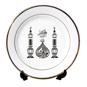 Assiette en porcelaine avec calligraphie artistique "Louange à Allah Seigneurs des Mondes" et "Allahu Akbar". Calligraphie réalisée par un calligraphe professionnel. Cette assiette se mariera bien avec tous types de mobilier.