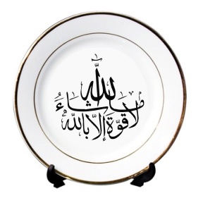 Assiette en porcelaine avec calligraphie du verset coranique "ما شاء الله لا قوة إلا بالله". Formule à lire afin de ne pas porter le mauvais oeuil quand on voit un bien fait donné à une personne. Calligraphie réalisée par un calligraphe professionnel. Cette assiette se mariera bien avec tous types de mobilier.
