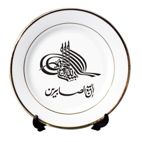 Assiette en porcelaine avec calligraphie artistique du verset coranique "Certes Allah est avec les patients". Calligraphie réalisée par un calligraphe professionnel. Cette assiette se mariera bien avec tous types de mobilier. La première calligraphie du haut représente la basmala (Bismillâhi rahmâni Rahîmi - Au Nom de Dieu le Miséricordieux, le Très Miséricordieux).