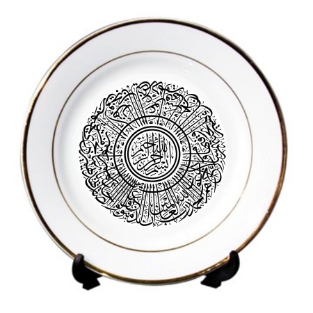 Assiette en porcelaine avec calligraphie artistique des versets 9 et 10 de Sourate Younous (Jonas). Calligraphie réalisées par un calligraphe professionnel. Cette assiette se mariera bien avec tous types de mobilier.