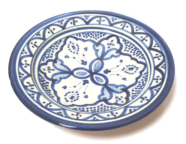 Assiette marocaine décorative en poterie émaillée peinte en blanc et bleu et ornée de motifs Deco & Cadeau