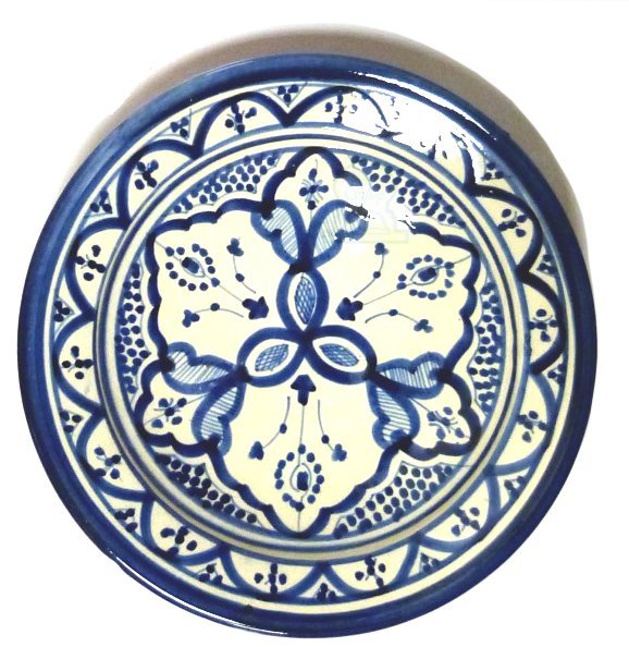 Assiette en céramique, en provenance de Marrakech (Maroc) de forme ronde, de couleur blanche et bleue, émaillée, décorée à la main avec de très beaux motifs traditionnels.