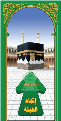 Autocollant indiquant la direction de la Qibla. A coller sur le mur ou sur le plafond. Le même autocollant existe avec verset coranique.