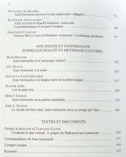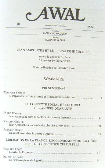 Pour son trentième numéro, Awal a choisi de publier les Actes du colloque de Paris, des 31 janvier et 1er février 2003, intitulé " Jean Amrouche et le pluralisme culturel " et réunissant une quinzaine de chercheurs de différentes disciplines. Quarante-deux ans après sa mort, l'apport tant politique que littéraire de Jean Amrouche est encore absent de la réalité algérienne. Un oubli peut-être inscrit dans la radicale étrangeté de celui qui ne se sentait " ni tout à fait français ni tout à fait africain ". Pourtant, certaines questions qu'il a su poser à l'État-nation sont restées presque entières. Parmi celles-ci, son désir de refonder une nation algérienne à partir de sa diversité ethnique, religieuse et culturelle. Un problème qui n'a toujours pas été résolu et qui explique en partie la crise actuelle. Occupant une place singulière du fait de son statut d'assimilé dû à sa confession chrétienne et à sa nationalité française, Jean Amrouche témoigne du dilemme de l'écrivain maghrébin, partagé entre la revendication des origines et le désir d'assimilation à la culture occidentale. Bien que se voulant cette " arche ", ce " pont qu'on piétine " entre deux mondes, la tragédie de 1945 et la guerre vont de plus en plus l'éloigner de la France, sa " patrie de l'esprit ", et le conduire à s'interroger sur le droit qui fonde le dominant à éliminer le dominé en raison de son infériorité ethnique et à décrire, en précurseur ce que Bourdieu appellera " la violence symbolique ", cette violence cachée que l'on subit malgré soi et qui consiste à inculquer chez le dominé le stigmate et à considérer qu'il le définit. Solitaire mais solidaire, Jean Amrouche va élever la voix pour défendre ses frères, en quête, comme lui, d'une identité et du " besoin tragique d'avoir un nom ". C'est ce parcours complexe et les problématiques qu'il soulève qui sont retracés ici.