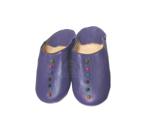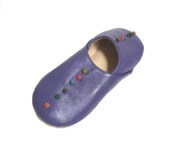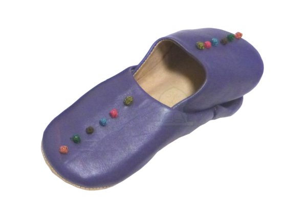 Babouche traditionnelle marocaine en cuir de couleur violette pour femmes. Ces babouches possèdent un bout - une extrémité - arrondi (e), pour plus de confort à l'intérieur. Ils sont décorés de jolis nœuds en Sabra multi-couleurs...