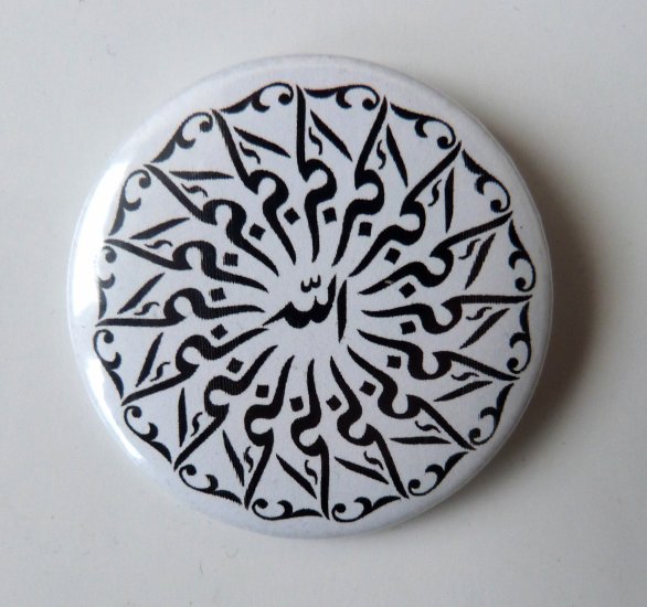 Badge avec calligraphie artistique de l'expression "Allâhu Akbar" (Allah est Grand) inscrite de façon concentrique avec le mot Allah au centre.