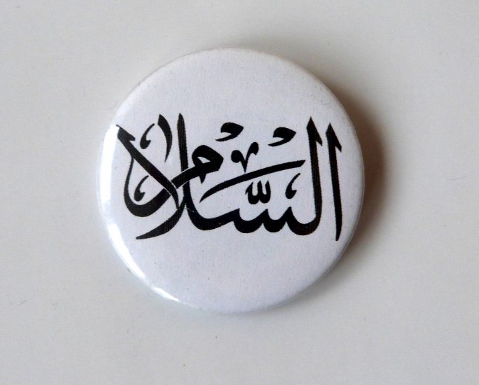 Badge avec le mot arabe "As-Salâm" (La Paix) calligraphié.