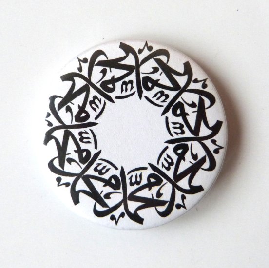 Badge du nom du Prophète Muhammad (saw) calligraphié de façon circulaire et imbriquée (répétition de motifs).