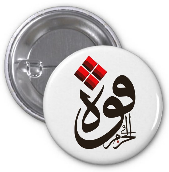 Badge avec très jolie calligraphie artistique du proverbe arabe "al-quwatu fil-hazm" القوة في الحزم (La force est dans le fait d'être résolu ou décidé à faire qq. chose). Dans cette calligraphie artistique le mot "Force" (قوة) est écrit en grand et les points des lettres Qaf et Ta sont rassemblées.