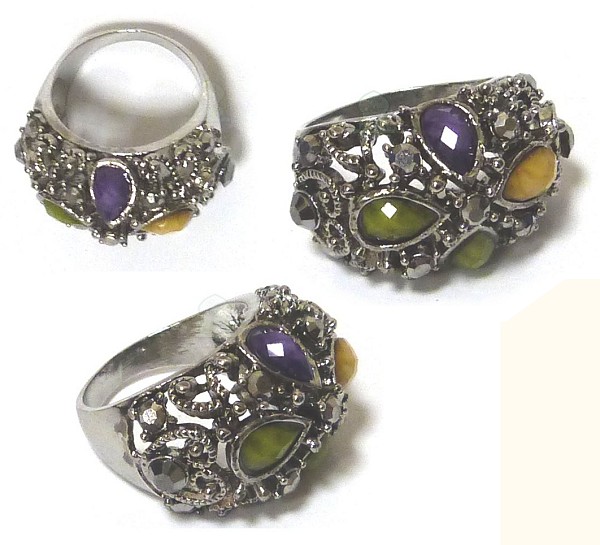 Quoi de plus séduisant pour embellir vos doigts... Une bague faite de métal argenté, ciselé de très beaux motifs, et incrustée de pierres délicatement sculptées en plusieurs formes, et pétillantes de couleurs...