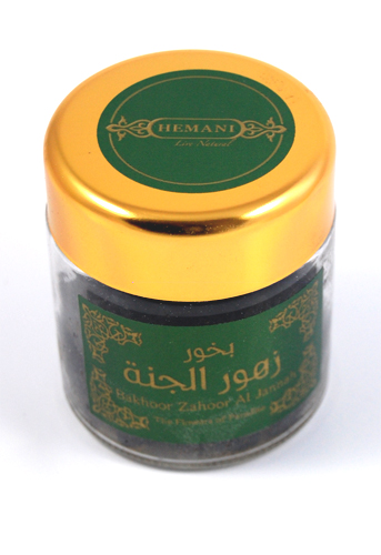 Encens (bakhour - بخور) "Zahoor Al Jannah" (Les fleures du Paradis), à base de poudre de bois et de parfum, dans un bocal à utiliser dans un bruleur d'encens (encensoir) ou avec un charbon incandescent.