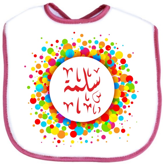 Bavoir pour bébé avec prénom personnalisé en arabe et/ou français inscrit au milieu d'un cercle de cœurs multicolores. Excellente idée cadeau pour une naissance.