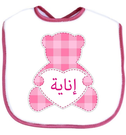 Bavoir pour bébé avec prénom personnalisé en arabe et/ou français inscrit au milieu d'un figure d'ourson. Excellente idée cadeau pour une naissance.