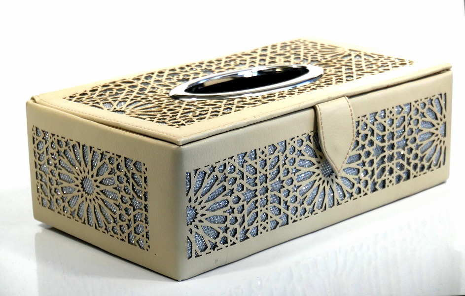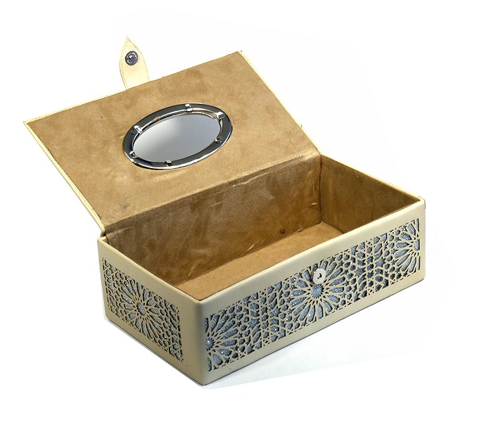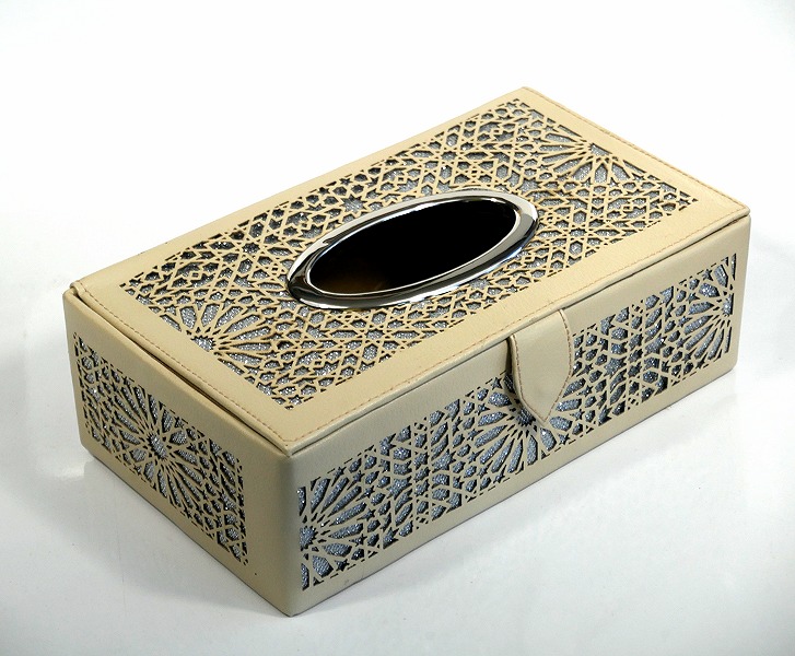 Boite a mouchoirs decorative en cuir de fabrication artisanale marocaine de couleur beige