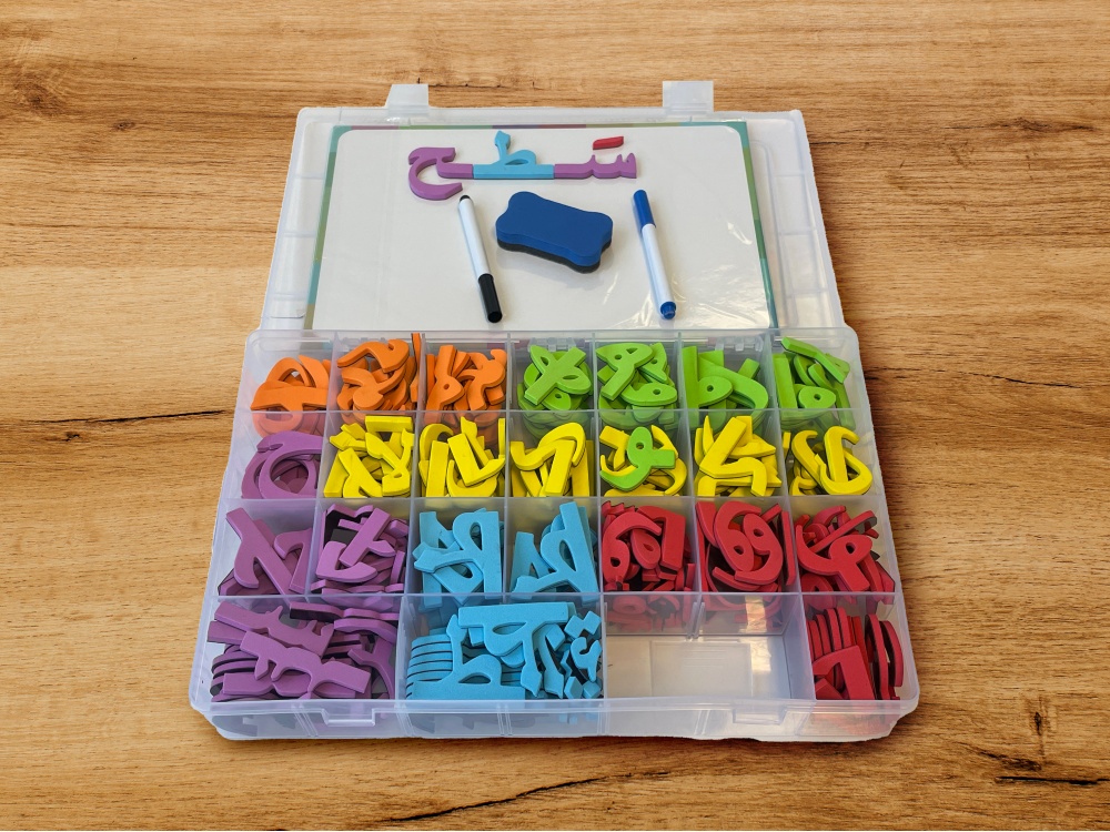 Cette mallette contient un très grand nombre de lettre et voyelles arabes magnétiques qui peuvent se fixer très facilement sur le tableau, avec toutes les combinaisons possibles afin de constituer les mots que l'on veut... Les points et les voyelles (tachkîl) sont également fournies seuls afin d'avoir encore plus de flexibilité et de possibilités d'écritures...