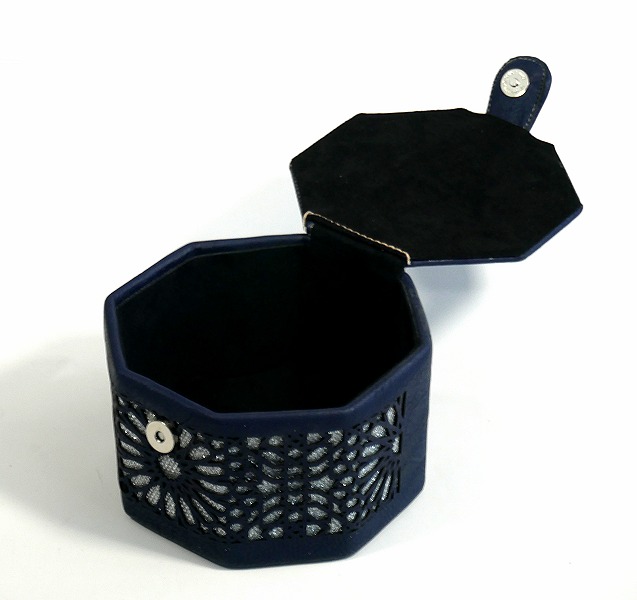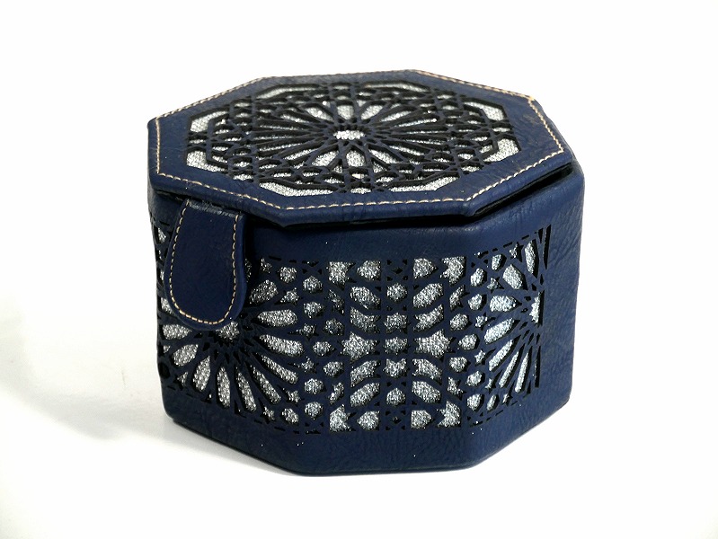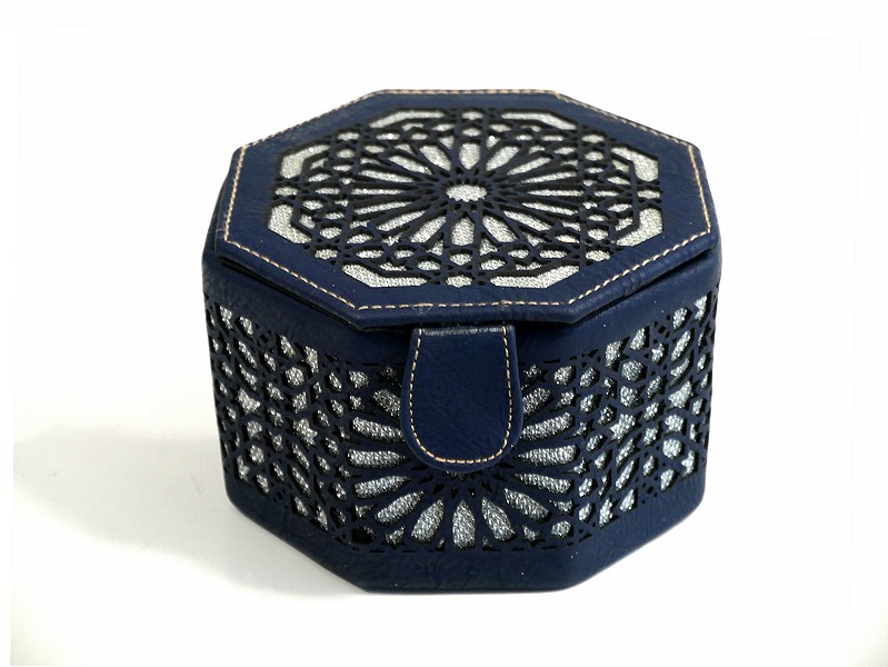 Boite de Rangement artisanale de forme octogonale en cuir avec des jolies motifs argentes - Couleur bleu nuit