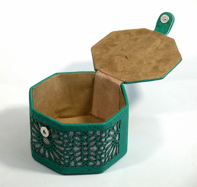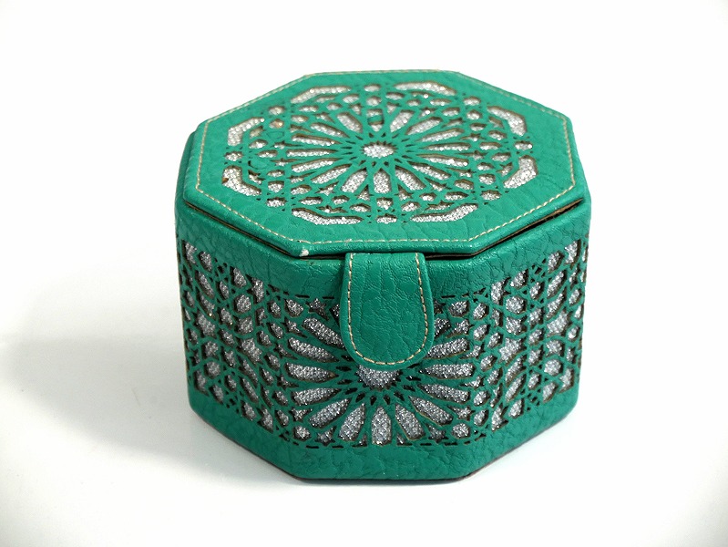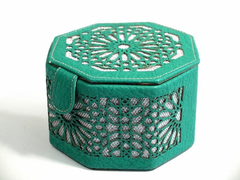 Boite de Rangement artisanale de forme octogonale en cuir avec des jolies motifs argentes - Couleur vert bleu