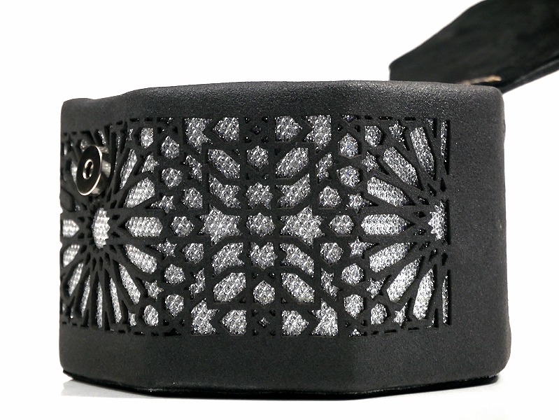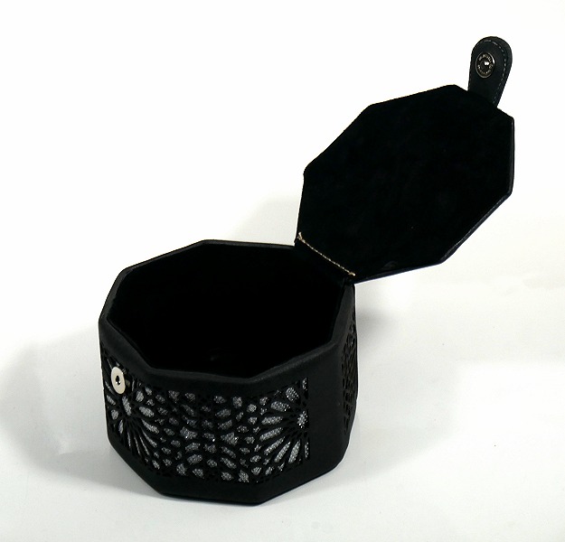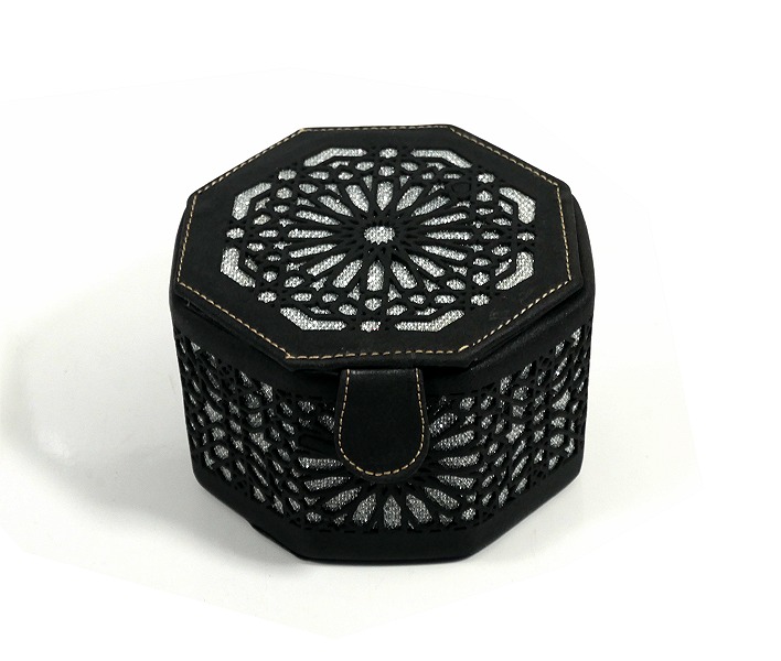 Boite de Rangement artisanale marocaine de forme octogonale noir en cuir avec des jolies motifs argentes