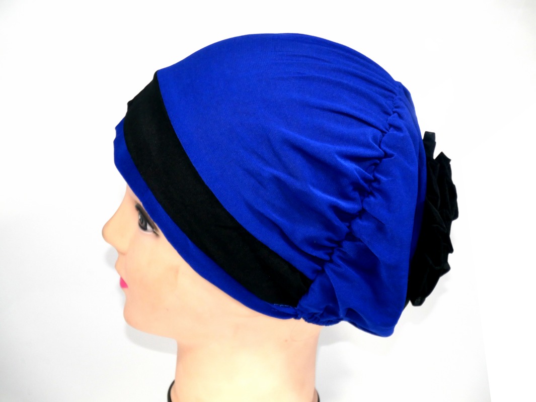 Bonnet bleu assorti d'une bande et d'une jolie fleur noire