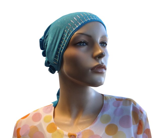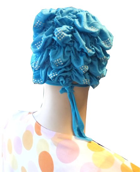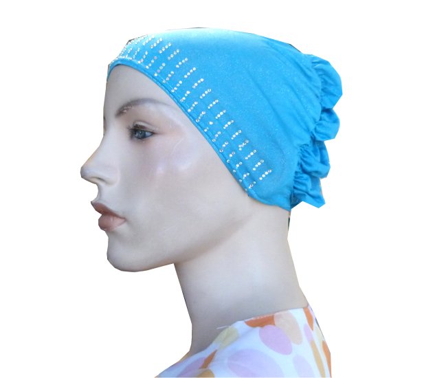 Bonnet bleu turquoise pailleté avec strass sur le devant ainsi que sur la coiffe.