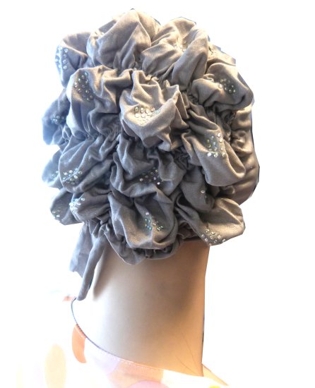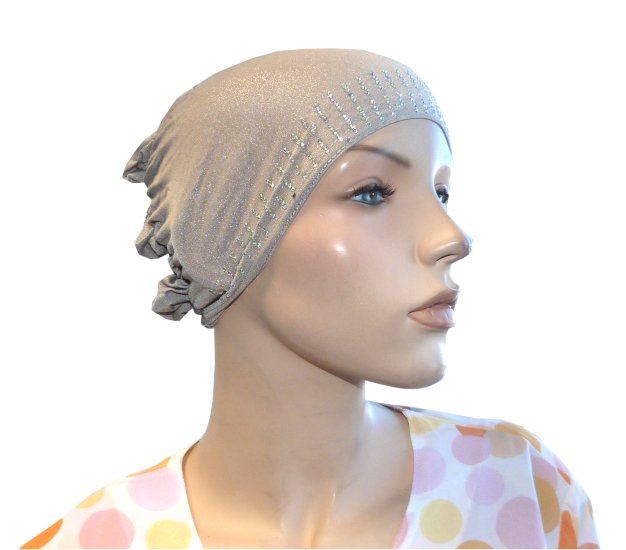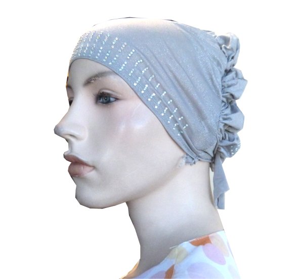 Bonnet gris clair pailleté avec strass sur le devant ainsi que sur la coiffe.