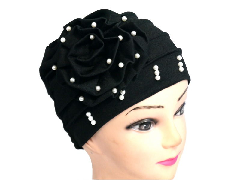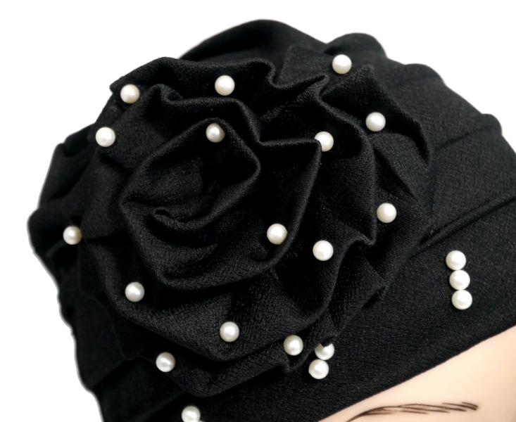 Bonnet perle avec une large fleur sur le cote de couleur noire unie