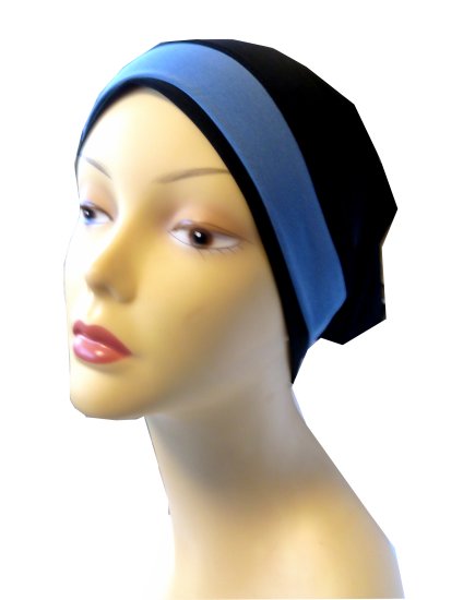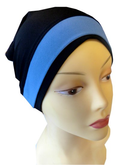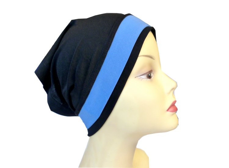 Bonnet noir extensible agrémenté d'une bande bleue turquoise à l'avant pour habiller vos hijabs avec style et modestie 24 cm.