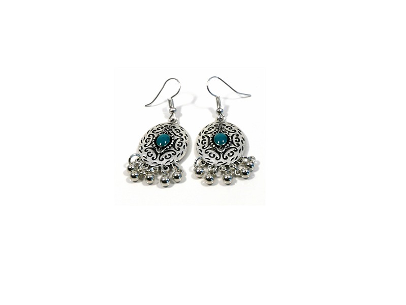 Boucles d'oreilles pendantes, style berbère, fabriquées en métal argenté - composition argent - délicatement ciselé, serties de pierres bleu vert.