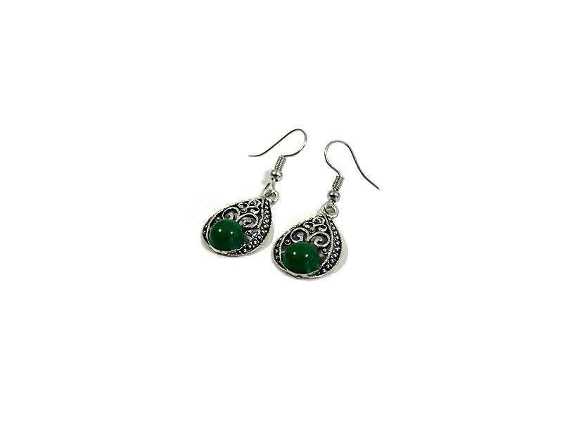 Boucles d'oreilles pendantes en métal argenté ciselé serties de pierres vert - REF. 29562 (5.90 €)