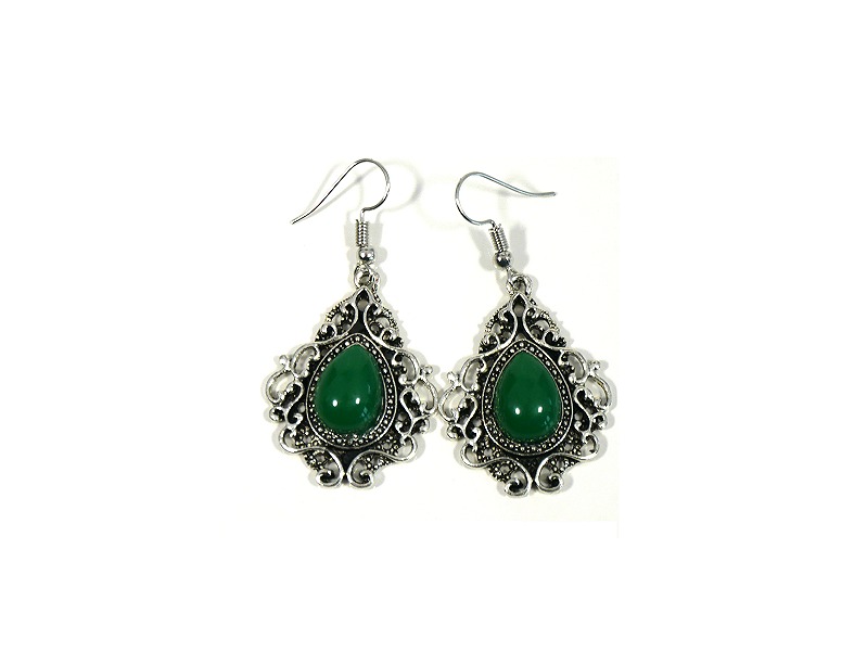 Boucles d'oreilles pendantes en métal argenté ciselé serties de pierres vert Vetement & Accessoire