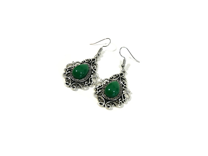 Boucles d'oreilles pendantes, style berbère, fabriquées en métal argenté - composition argent - délicatement ciselé, serties de pierres vert.
