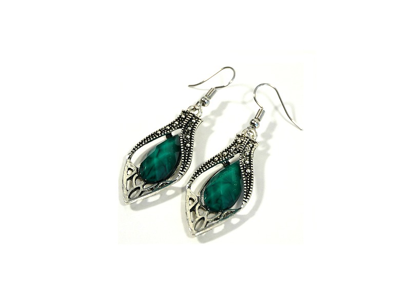 Boucles d'oreilles pendantes en métal argenté ciselé serties de pierres vert Vetement & Accessoire