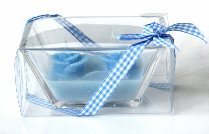 Bougie double parfumée dans sa boite avec un ruban cadeau de couleur bleu ciel - REF. 25900 (2.75 €)