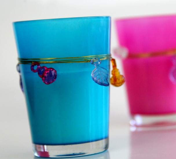 Photophore / Bougeoir en verre avec bougie cerclée de métal argenté ciselé terminé d'un pompon en Sabra - Modèle bleu - REF. 16860 (9.90 €)