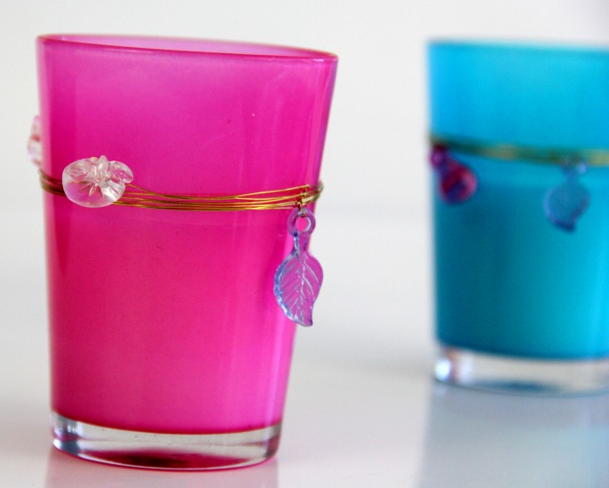 Photophore / Bougeoir en verre avec bougie cerclée de métal argenté ciselé terminé d'un pompon en Sabra - Modèle violet - REF. 16864 (9.90 €)