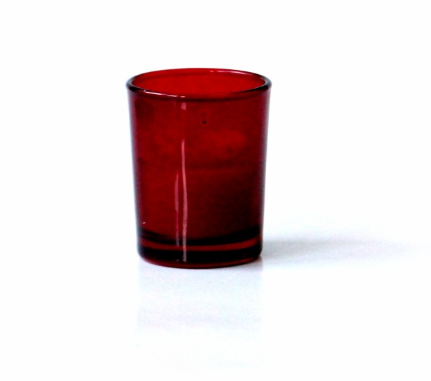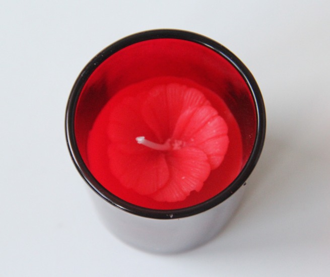 Bougie parfumée sous forme de fleur de couleur bordeaux dans un verre.
