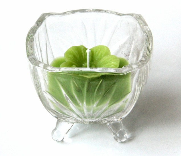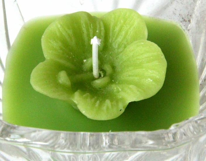 Bougie parfumée sous forme de fleur de couleur vert dans un joli récipient en verre.