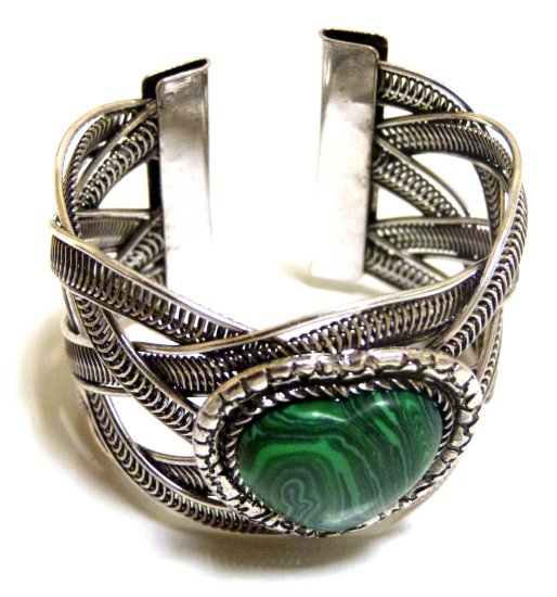 Bracelet Cuff ajustable en metal argente cisele orne de pierre verte sous forme de coeur
