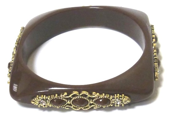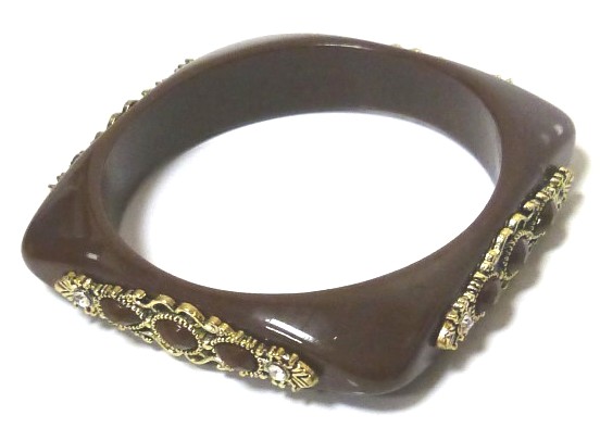 Bracelet fantaisie pour femmes, marron foncé, en plastique, décoré de jolis ornements dorés et sertis de perles...