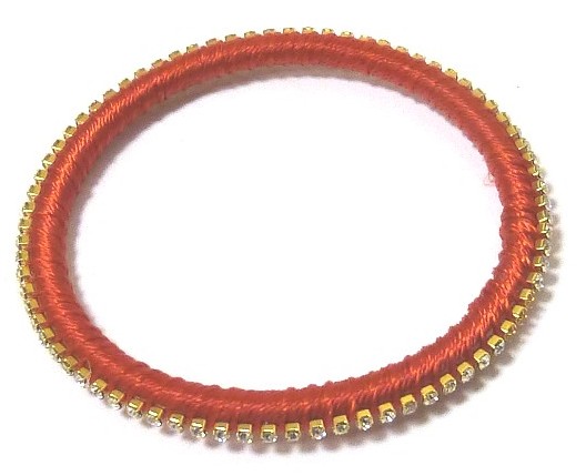 Bracelet fantaisie pour femmes, semi rigide, confectionné artisanalement en fil brillant de couleur rouge unie, et serti de jolies pierres cristallines...