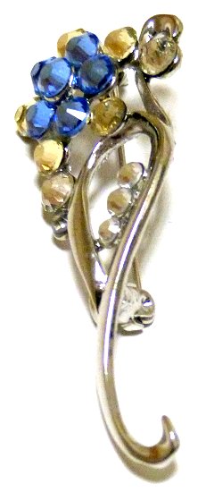 Broche argentée en forme de fleur avec diamants bleus jaunes et blancs.