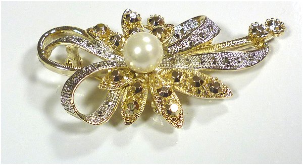 Broche contenant des parties dorées et argentées, sous forme de fleur avec une grosse perle blanche et strass.