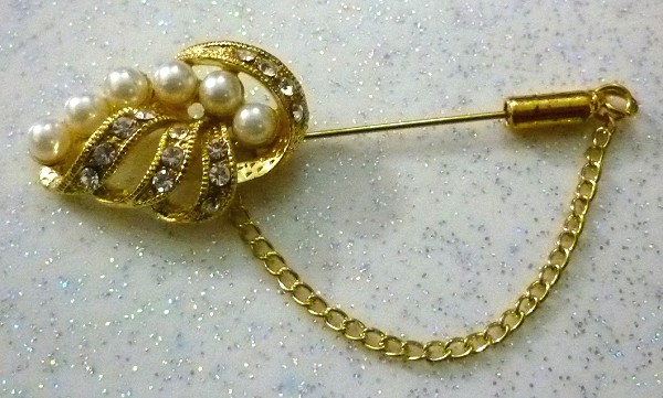 Broche pour Hijab dorée en forme de fleur, agrémentée de pierres diamantées et de perles blanches alignées.