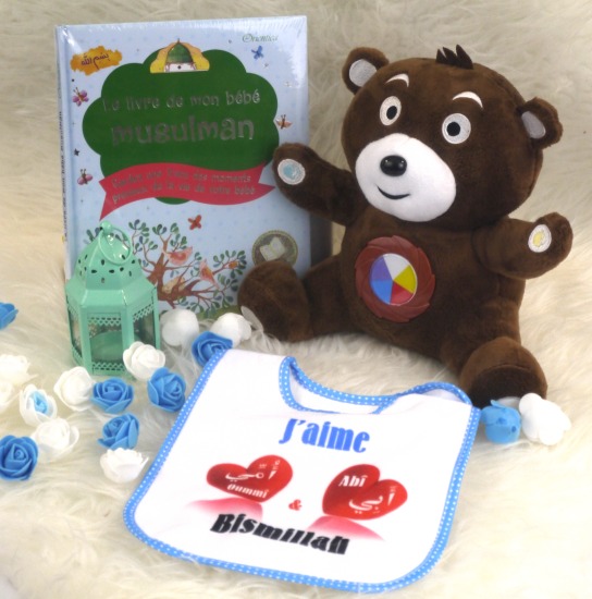 Cadeau de naissance pour mon bebe (special garcons) : Nounours Salah parlant - Le livre de mon bebe musulman - Bavoir