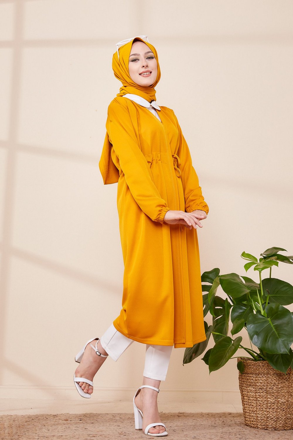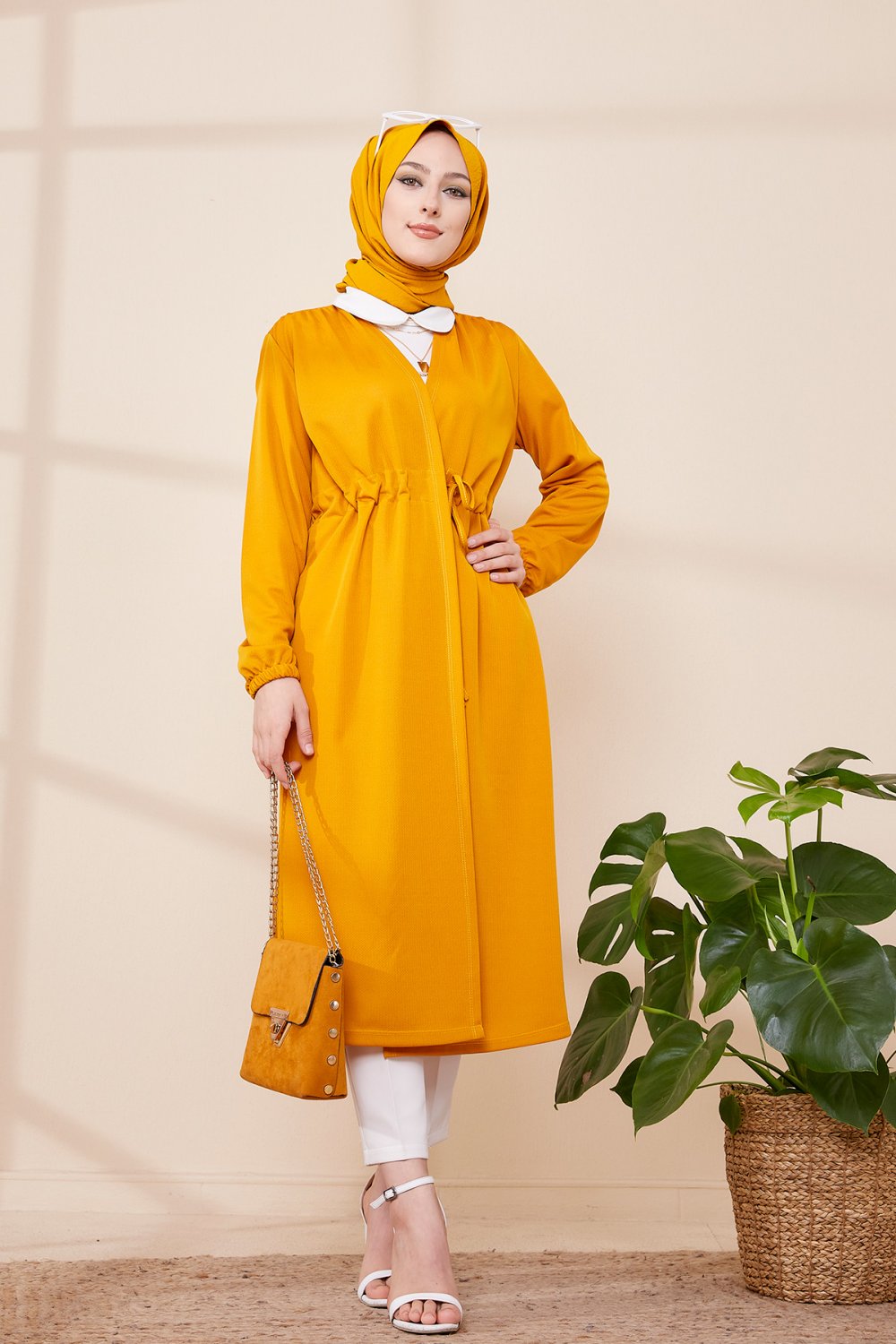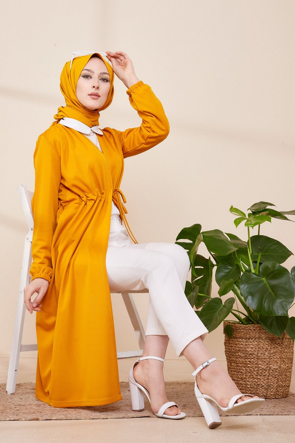 Cardigan a lacets pour femme (Gilet long - Boutique Vetement Hijab Paris) - Couleur jaune moutarde
