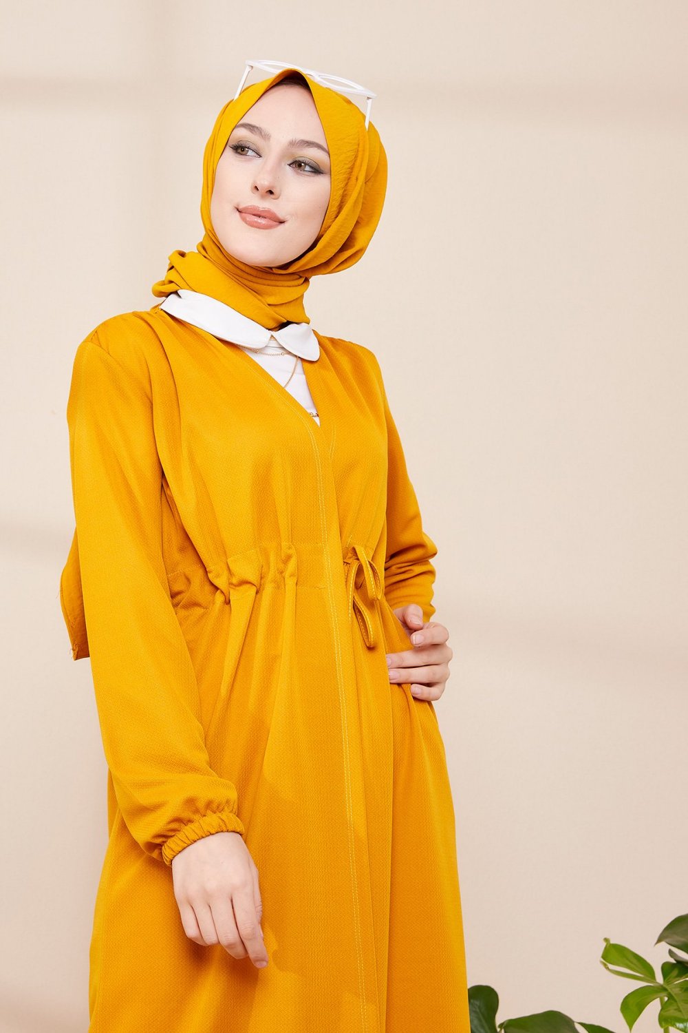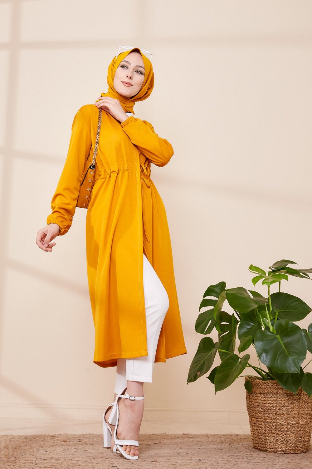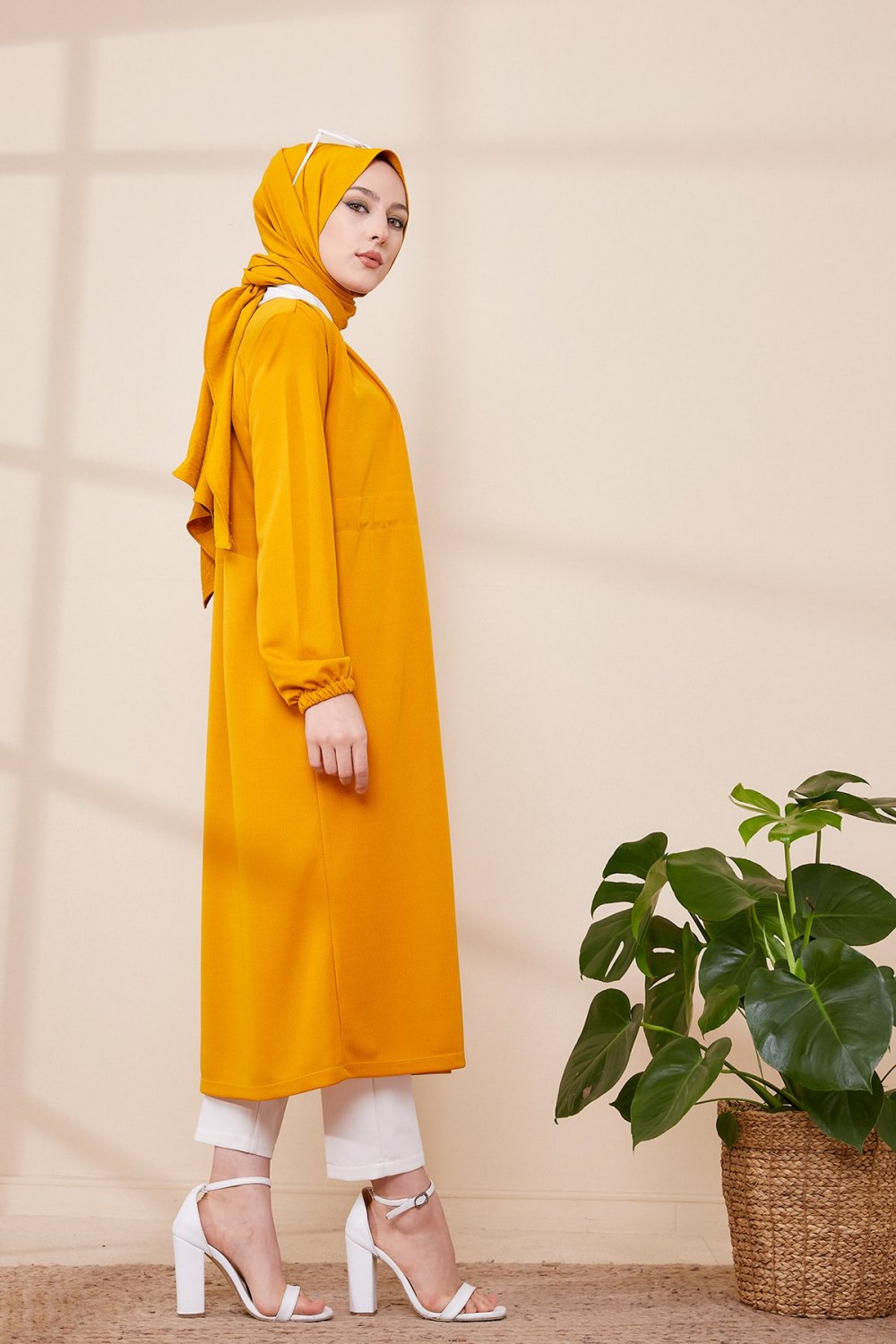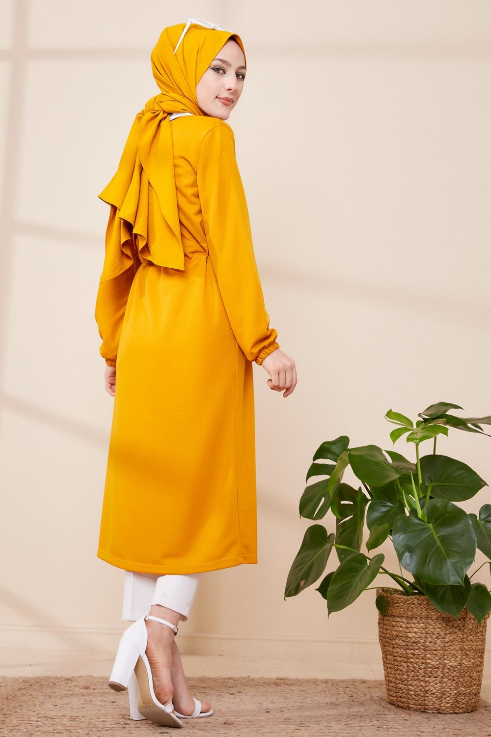 Cardigan a lacets pour femme (Gilet long - Boutique Vetement Hijab Paris) - Couleur jaune moutarde